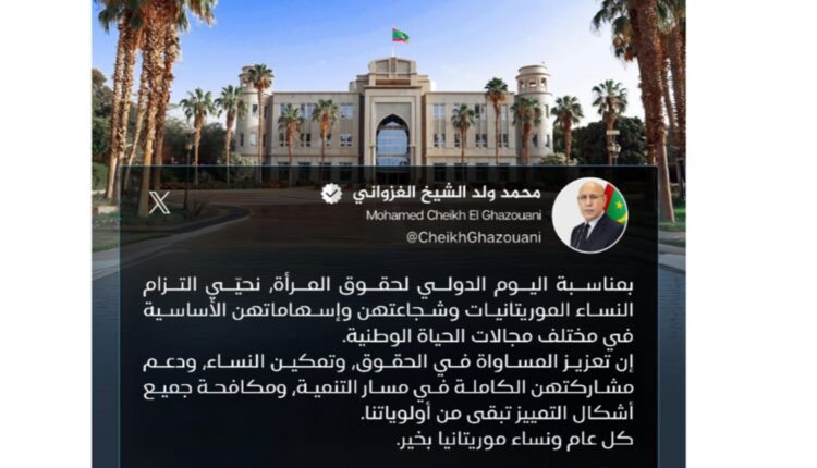 “بمناسبة اليوم الدولي لحقوق المرأة، نحيّي التزام النساء الموريتانيات وشجاعتهن وإسهاماتهن الأساسية في مختلف مجالات الحياة الوطنية.