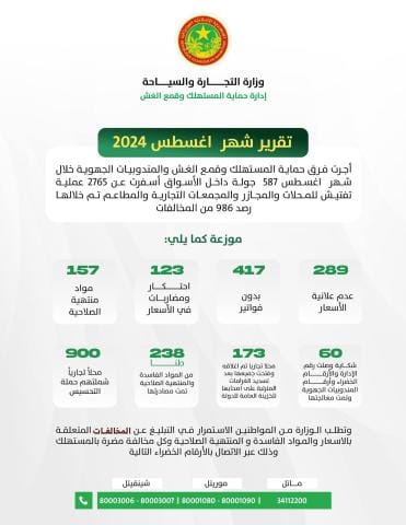 أجرت فرق حماية المستهلك وقمع الغش والمندوبيات الجهوية خلال شهر اغسطس 587 جولة داخل الأسواق أسفرت عن 2765 عملية تفتيش للمحلات والمجازر والمجمعات التجارية والمطاعم تم خلالها رصد 986 من المخالفات موزعة كما يلي :