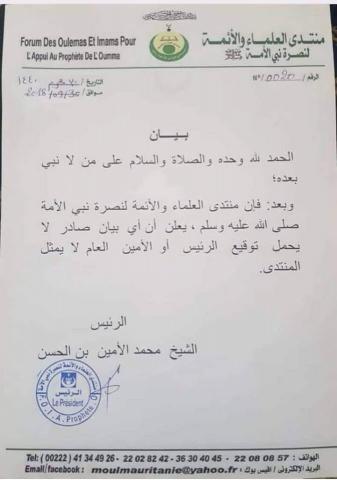 وردا عليه اصدر منتدى العلماء والأئمة لنصرة نبي الأمة صلى الله عليه وسلم بموريتانيا بيانا جديدا يفيد بأن ولد مزيد غير مخول للتوقيع باسم المنتدى حيث نص البيان على أن " أي بيان لا يحمل توقيع رئيسه أو أمينه العام لا يمثله."