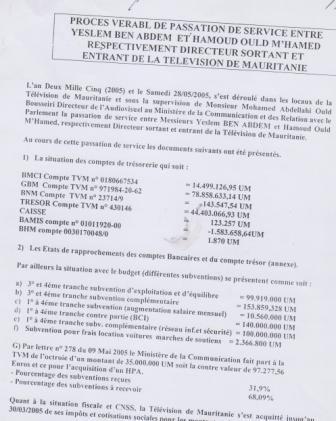 - الأرقام التي قدمها يسلم دقيقة جدا رغم أنها لا تشمل الهيئتين المعنيتين. هي و المحضر المتضمن لها يتعلقان بتسييره للتلفزة ولا شيء فيهما حول فترة إدارة السيد يسلم للوكالة الموريتانية للإنباء. مما يجعلنا نتوقع منه في القريب العاجل نشر محضر التسليم المتعلق بهذه المؤسسة الأخيرة أو وثائق استدلالية أخرى حول تسييره لها.. علما انه ذكر أن تهمة الفساد الموجهة إليه قد طالتها، واعتبارا أيضا لكونه مهتم بالأرشيف المتعلق بتسييره وبالمحافظة عليه، كما يتبين ذلك من نشره للوثائق المرفقة.