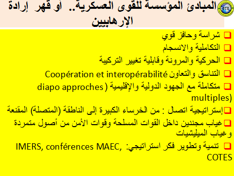 وشعوري شخصيا تجاه الجيش ومنظومتنا الوطنية للدفاع والأمن يتجلى من خلال ما حاولت بيانه. ومن أهم ما قلته في هذا الصدد ما جاء في "اسلايد" التالي الذي حصرت فيه بعض المبادئ المؤسِّسة منذ العشرية الأخيرة لعمل القوات المسلحة وقوات الأمن  في مجال محاربة الإرهاب والجريمة العابرة للحدود :
