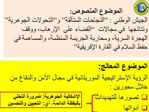 "  تعد موريتانيا اليوم من طرف كثيرين نموذجا في محاربة الإرهاب.. لكنها لم تتغلب نهائيا على هذه الظاهرة الفتاكة  التي تنتشر قواها بشكل خطير قرب حدودنا.. كما أن البلد ليس في مأمن من الإرهاب الداخلي الذي كان وما زال يعرف تحت تسميات مختلفة مثل "الذئاب المنفردة" و"الخلايا النائمة" ... غير أنه تبين أنه لا يوجد إرهابي إلا وله علاقة مع مجرم أو مجرمين آخرين؛ كما أنه لا توجد "خلايا نائمة" وإنما تنظيمات سرية تعمل بنشاط في الخفاء.