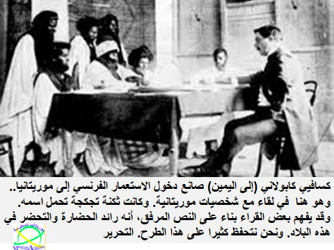 عندما جاء الحكم الفرنسي لموريتانيا كان هنا مائة الف شخص اغلبهم يحمل فيروس الكبد الوبائي...ولم يجدوا هنا اي رباط ولا اي منارة ..ولم تكن هنا صلاة جمعة...ولا عيد فطر..ولا اضحى ..ولا اي شيء دوري متسلسل.