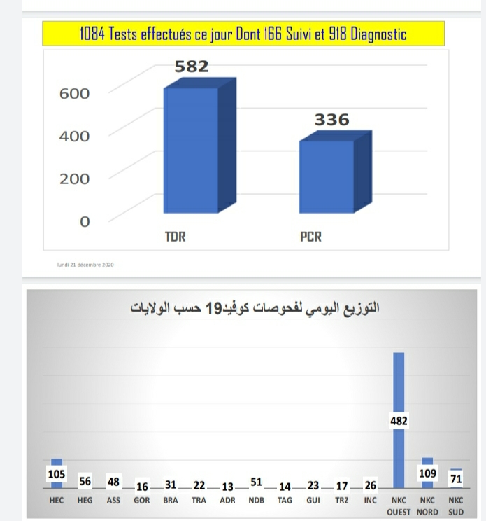 وقد يكون لهذا التراجع في عدد الأموات علاقة سببية بالتحسن المتعلق بوسائل التكفل بالمرضى، الذي ذكره أمس المنسق الوطني لمكافحة كوفيد 19. وينبغي الآن العمل من اجل تحقيق تحسن مماثل أو افضل في وسائل فحوص التشخيص. (انظر: (...) د. ولد الزحاف يقدم شروحا تبشر وتخيف في آن واحد.").