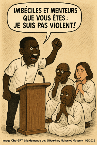2- خطابه أعتى منه. فحتى حين يؤكد أنّ نهجه سلمي، مناوئ للعنف، تسيطر على لسانه كلماتٌ مشحونة بالسلبية، له فيها قاموس ثري باللغة العامية : ''أقْويْصدْ، ''أمّْينِ معتذر''، ''زَيْفطو''، ''اكذَيبْ''... وكأن الطبع يغلبُ التطبعَ.
